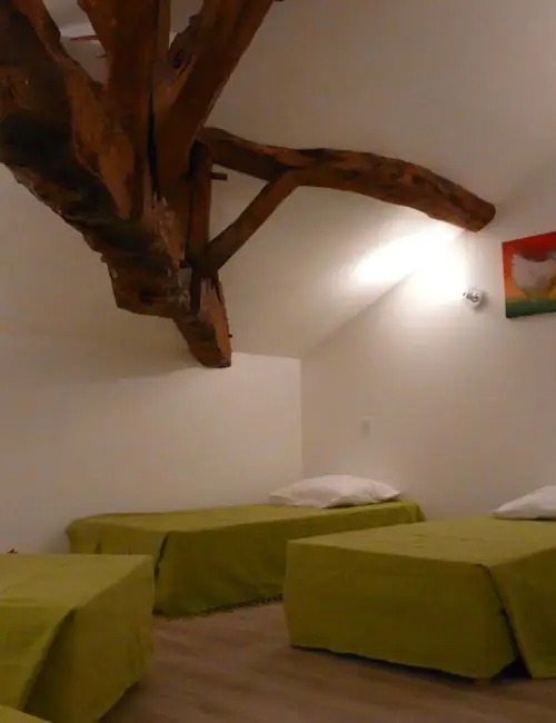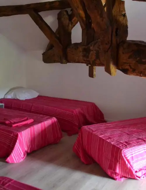 Ses 270 m² sont répartis sur trois niveaux. Ce gîte se compose de 6 chambres dotées d’un coin douche et lavabo, dont 4 chambres doubles parentales et 2 chambres-dortoirs de 4 et 5 lits simples. 3 toilettes/WC et 2 salles de bains indépendantes complètent les installations sanitaires à disposition.