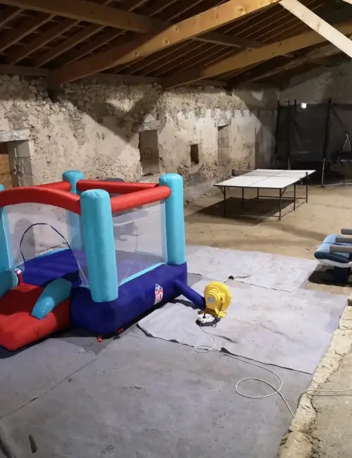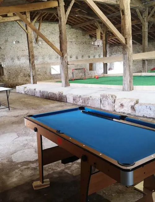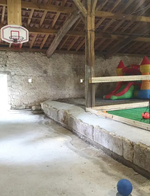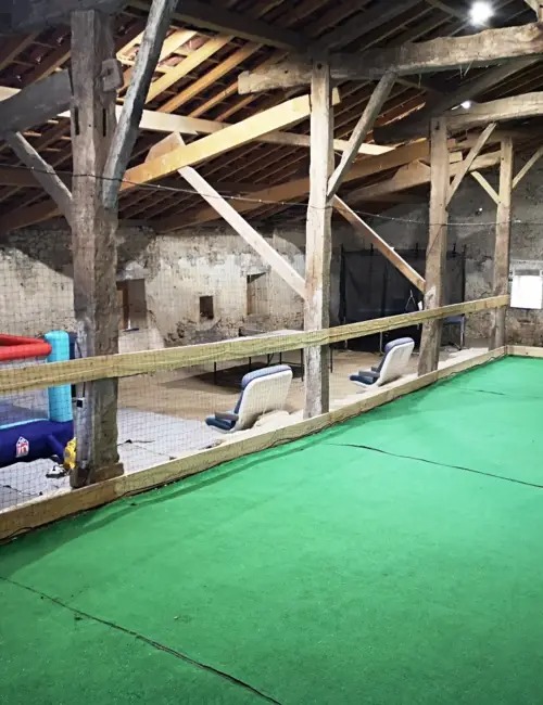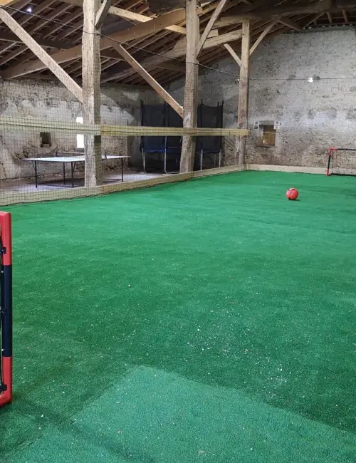 Véritable aire de jeux et de détente, la grange de 450m2 abrite un terrain de foot salle, un panneau de basket, un billard, un baby foot, un trampoline, un château gonflable et un coin spa.